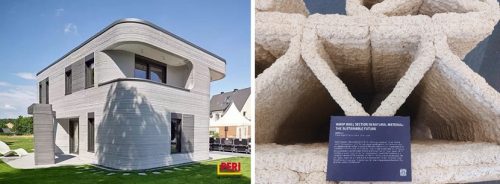 Beckum Einfamilienhaus und WASP: © Haus in Beckum; PERI 3D Construction (links) © WASP-Wandstruktur; Mittelstand-Digital Zentrum Ilmenau (rechts)