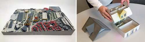 Folgendes Foto zeigt zwei Beispiele. Links ist ein Geländemodell der Ernst-Abbe-Hochschule Jena zu sehen. Die Daten für die Erstellung des erforderlichen Computermodells – wie City-GML, Orthofotos und digitale Geländemodelle – sind frei zugänglich. Für die Zusammenführung und Prozessierung der Daten wurde eine spezielle Software verwendet. Rechts ist das Modell eines 3D-gedruckten Einfamilienhauses abgebildet.