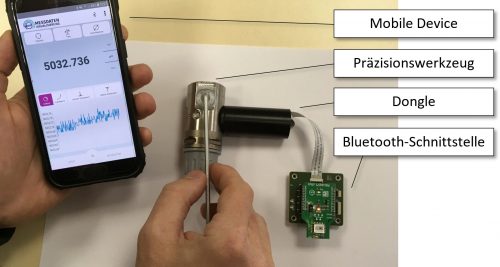 Die Modellfabrik Prozessdaten des Mittelstand-Digital Zentrums Ilmenau hat daher eine Demonstrator-Lösung erarbeitet, wie mittels Applikation auf einem Mobile Device und einer entsprechenden Bluetooth-Schnittstelle direkt die bisher manuell abgelesenen Einstellwerte der Zerspanungsschneide nun digital ermittelt werden können. Hierzu ist durch den Fertigungsmitarbeiter ein mobiler Dongle an das Werkzeug per Drag-and-Drop anzuschließen und mit der speziell hierfür realisierten App „Messdaten Visualisierung“ der Modellfabrik Prozessdaten mittels Bluetooth-Schnittstelle an ein Mobile-Device zu koppeln. Nun können in Echtzeit die am Werkzeug eingestellten Parameter in der App abgelesen und somit wesentlich einfacher entsprechende Einstellungen am Werkzeug vorgenommen werden.