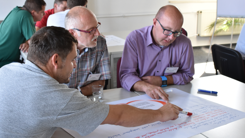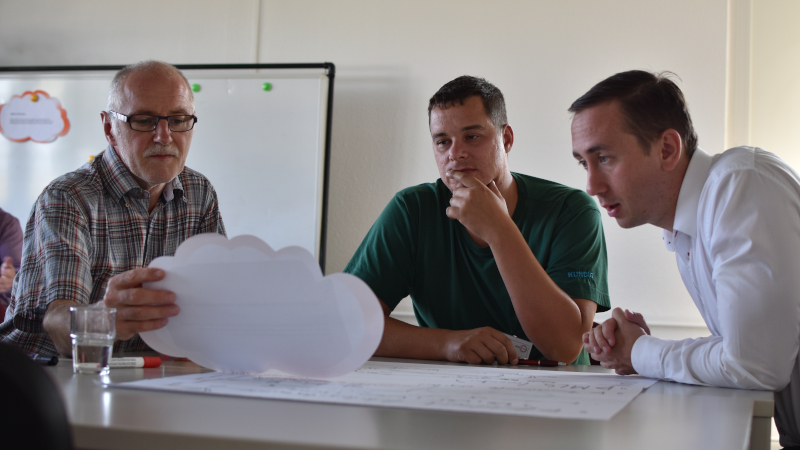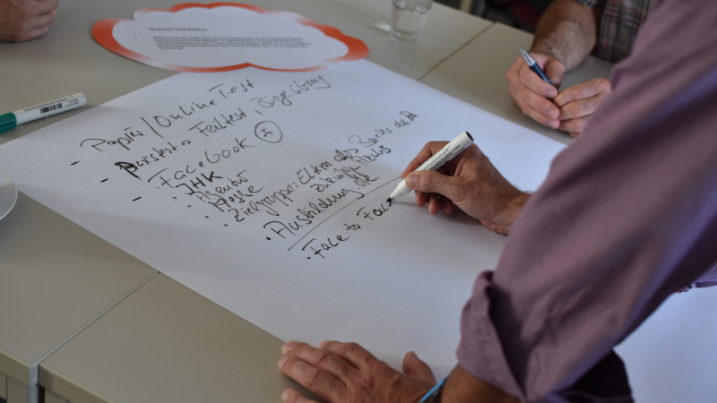 Der darauffolgende Workshop bot mit dem „World Café“ eine Plattform für den Erfahrungsaustausch der Ausbilder aus verschiedenen kleinen und mittleren Unternehmen. Sie diskutierten über Probleme, Chancen und Risiken von Digitalisierungsmöglichkeiten für Berufsausbildungen. Bereits zu Beginn wurde schnell klar: die anwesenden KMU stehen auf dem Weg zur Digitalisierung an ganz unterschiedlichen Punkten. Es wurden Tipps gegeben, Software empfohlen und Erfahrungen aus dem Berufsalltag ausgetauscht.