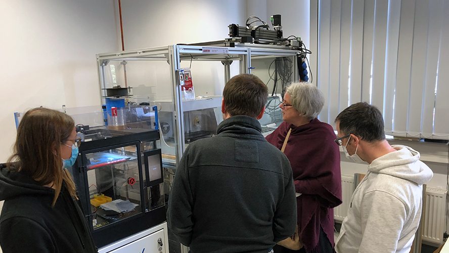 Kerstin Michalke und Constance Möhwald trafen auf einen sehr interessierten Teilnehmerkreis. Schon bei der Vorstellungsrunde kam man ins Gespräch und es fanden sich viele Anknüpfungspunkte, auf die im nachfolgenden Vortrag Bezug genommen wurde. Auch die sehr anschaulichen 3D-Druck-Beispiele aus unserer Mustersammlung, die zu den einzelnen Verfahren herumgereicht wurden, lockerten die Atmosphäre auf und führten zu angeregten Diskussionen mit den fünf Teilnehmenden. Von besonderem Interesse waren dabei die Möglichkeiten, sehr filigrane Strukturen und Objekte aus Metall additiv herzustellen. Die in der Theorie betrachteten Anwendungen und technischen Lösungen wurden anschließend auf einem Laborrundgang auch praktisch gezeigt.