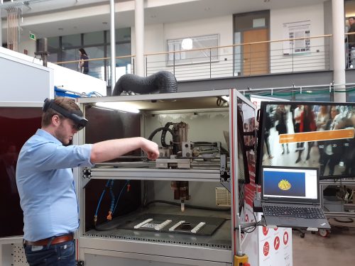Im Anschluss wurde von Mathias Eiber von der Modellfabrik Vernetzung die HoloLens vorgestellt. Mit Hilfe dieser Datenbrille können erfahrene Maschinenbediener Montage- und Fertigungsschritte visuell und akustisch aufzeichnen, so dass die aufgenommenen Daten unabhängig vom jeweiligen Mitarbeiter und seinem Knowhow als Datensatz zur Verfügung stehen.