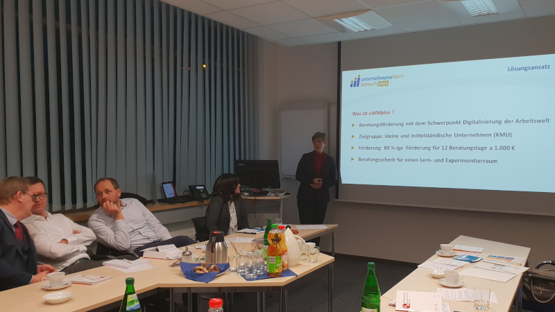 Welche Förderungen es gibt, um sich zur Bewältigung dieser Herausforderungen Expertenwissen ins eigene Unternehmen zu holen, stellte Anette Friedrich vom IWT (Institut der Wirtschaft Thüringens GmbH) anhand des Förderprogramms “unternehmensWert: Mensch plus” vor.