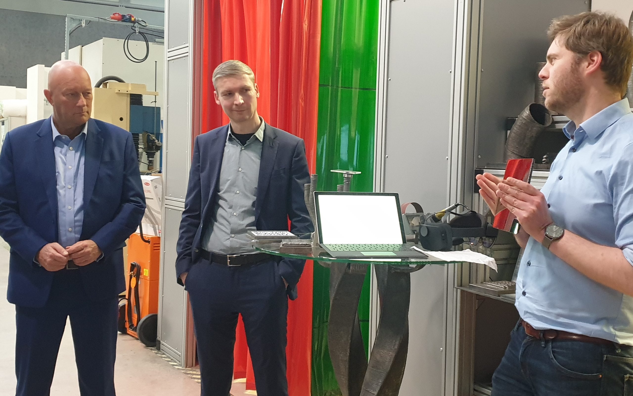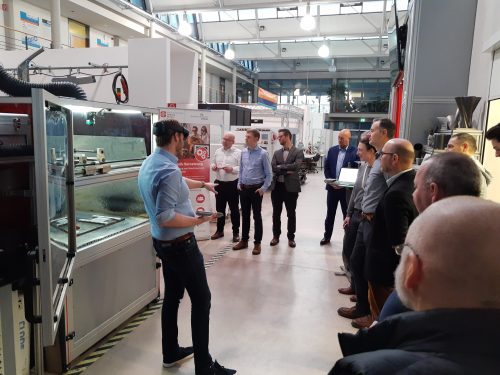 Mathias Eiber, Mitarbeiter der Modellfabrik Vernetzung an der TU Ilmenau, zeigte den Gästen am praktischen Beispiel, wie solche Digitalisierungslösungen aussehen können. Er erklärte, wie der 3D-Druck von Metall funktioniert und wie die Blockchain-Technologie unternehmensübergreifende Zusammenarbeiten ermöglicht. Er zeigte mit einer HoloLens live, wie Augmented Reality (AR) eine effektivere Arbeit an Bestandsmaschinen ermöglicht. Im Anschluss wurde dem Digitalisierungsausschuss in der Modellfabrik Smarte Sensorsysteme am IMMS Institut für Mikroelektronik – und Mechatronik-Systeme gemeinnützige GmbH (IMMS GmbH) von Dr. Frank Spiller anhand verschiedener Demonstrationen gezeigt, dass auch oft kleine und kostengünstige Lösungen eine große Effizienzsteigerung für Unternehmen darstellen können. Er zeigte beispielsweise, wie sich mit Sensorik Druckluftleckagen schnell und einfach aufspüren lassen, und somit eine rasche Fehlerbehebung ermöglicht wird – was direkt zu Kosteneinsparungen führt.