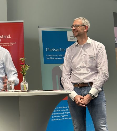 Dr. Sigrun Fuchs von der ThaFF (Thüringer Agentur für Fachkräftegewinnung) führte die Vortragsrunde weiter und sprach über die aktuellen Herausforderungen bei der Fachkräftegewinnung im Mittelstand, aber auch der Bindung der Mitarbeiter und Mitarbeiterinnen. Vereinbarkeit von Familie und Beruf stand für Sie im Mittelpunkt sowie die Umsetzbarkeit von familienbewusster Personalpolitik in Unternehmen in der heutigen Zeit. Sie stellte dabei auch die Angebote der ThaFF für Unternehmen vor. Sie betonte, dass die betriebliche Gesundheitsförderung wichtig für alle Arbeitnehmer und Arbeitnehmerinnen ist.