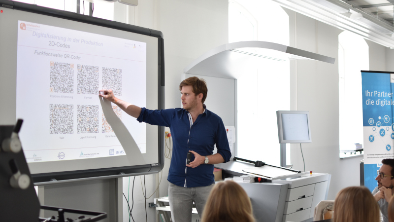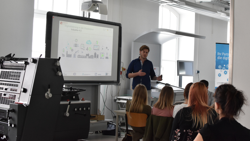 Dabei zeigten die Experten aus den Modellfabriken des Mittelstand 4.0-Kompetenzzentrums Ilmenau den Schülern anhand eigener Erfahrungen und Projekte die Chancen der Digitalisierung für den Mittelstand. Die Berufsschüler, angehende Werkzeugmechaniker und Medientechnologen der Fachrichtung Druck, konnten an den herstellerunabhängigen Industrie 4.0-Demonstratoren die komplette digitalisierte Wertschöpfungskette im Detail erleben und verstehen.