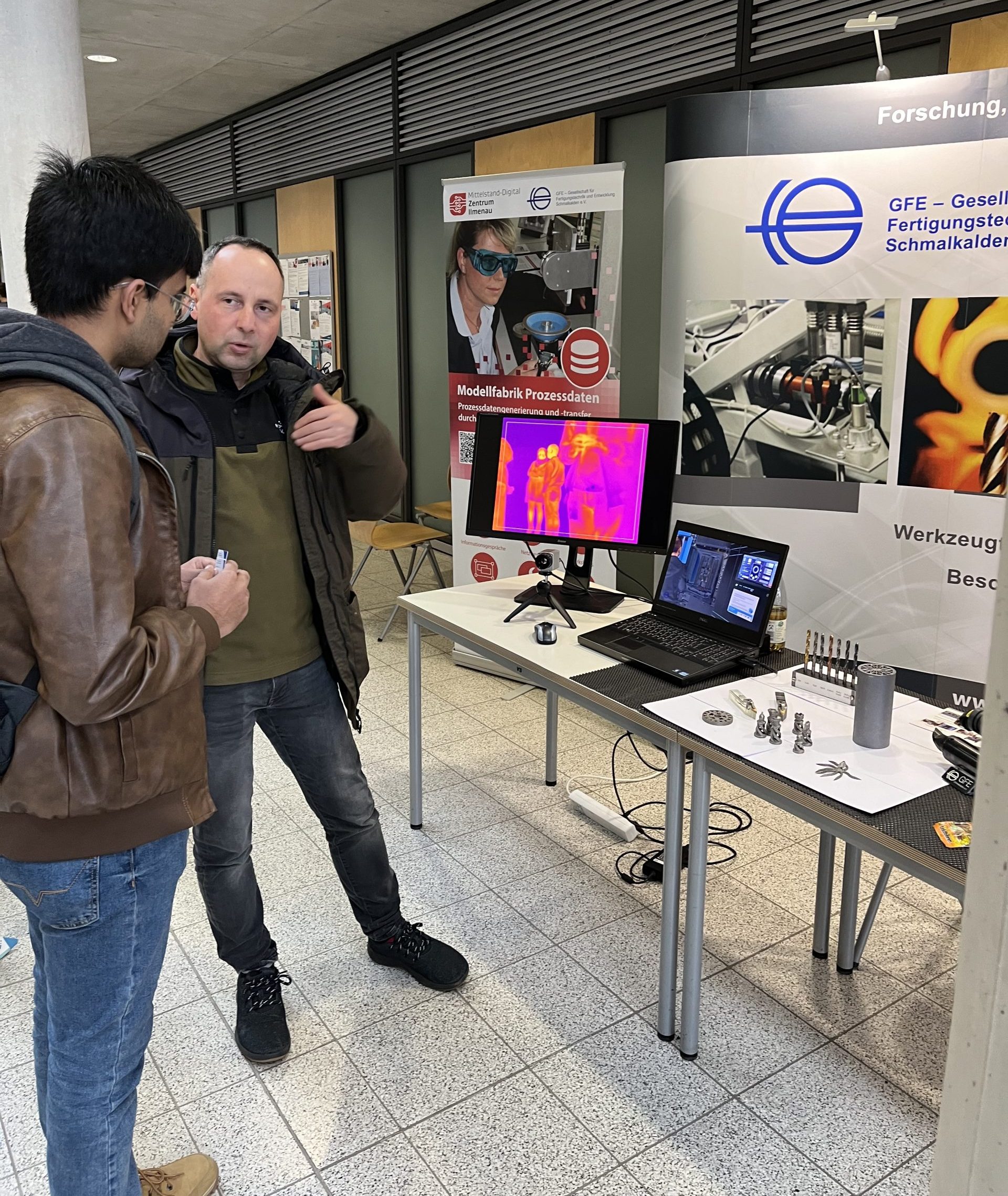Das Mittelstand-Digital Zentrum Ilmenau, mit der Modellfabrik Prozessdaten in der GFE – Gesellschaft für Fertigungstechnik und Entwicklung Schmalkalden e.V., zeigte an einem Infostand, wie die jungen Forscher auch zukünftig ihre Leidenschaft und ihren Entdeckerdrang in der Forschung und Entwicklung umsetzen können. Gemeinsam mit der Hochschule Schmalkalden konnten die jungen Köpfe für die Bereiche Ingenieurwissenschaften und innovative Technologien begeistert werden. Am Stand wurden Demonstrationsmodelle, wie eine Thermo-Kamera mit Echtzeit-Thermografie sowie weitere interessante Objekte und Beispiele aktueller Forschungsarbeiten und Mess-Equipment vorgestellt, was sich als echter Publikumsmagnet erwies und das junge Publikum begeisterte. Die faszinierten Gesichter der Jugendlichen zeigten, wie sehr sie beeindruckt waren von dem, was in Technik alles möglich ist. Dies macht Mut für die Zukunft und Freude, diese vielversprechenden Köpfe auf ihrem Weg zu begleiten!