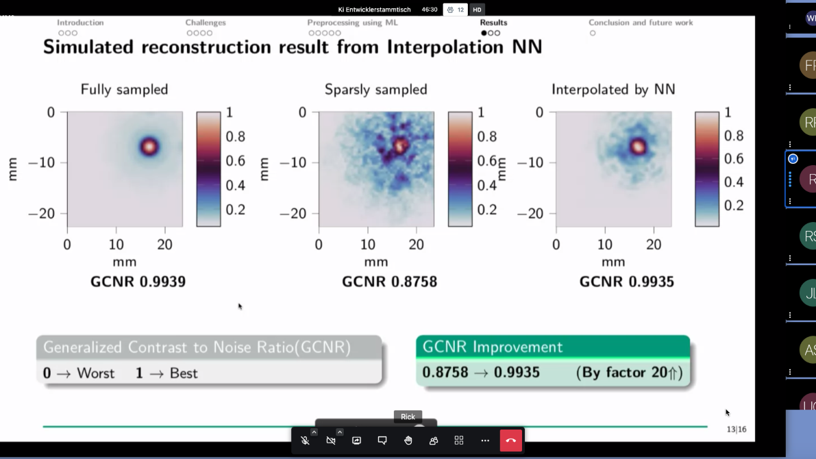 In der mittlerweile achten Ausgabe des KI-Entwicklerstammtisches des Mittelstand 4.0-Kompetenzzentrums Ilmenau ging es ein weiteres Mal um den Einsatz von KI-Technologien bei der Aufbereitung und Verarbeitung von Messdaten für industrielle Anwendungen. In einem Online-Meeting präsentierten Rick Pandey und Sayako Kodera den 12 Teilnehmenden Ergebnisse, welche sie im Rahmen ihrer Masterarbeiten an der TU Ilmenau erzielten. Die von ihnen bearbeiteten Aufgabenstellungen ergaben sich aus den Forschungsarbeiten der Ilmenauer SigMaSense-Gruppe vom Fraunhofer IZFP. Bei der Zustandsüberwachung und Wartung von Industrieanlagen wie z.B. Rohrleitungssystemen kommen ultraschallbasierte Mess- und Prüfverfahren zum Einsatz. Bei einfachen Oberflächen und leicht zugänglichen Prüfobjekten können automatisierte Messsysteme zum Einsatz kommen, häufig sind jedoch aufwändige manuelle Messungen notwendig. Die dabei erhobenen Daten weisen typischerweise Lücken und Verfälschungen auf. In ihren Vorträgen zeigten Rick Pandey und Sayako Kodera Möglichkeiten auf, wie sich fehlende Messdaten mit Hilfe von Deep Neural Networks (DNN) interpolieren bzw. rekonstruieren lassen. Fragen zum Trainingsaufwand und zur Erzeugung synthetischer Daten sowie typischen Anwendungsfällen für die vorgestellten Verfahren wurden zum Abschluss der Veranstaltung im Kreis der Teilnehmenden diskutiert.