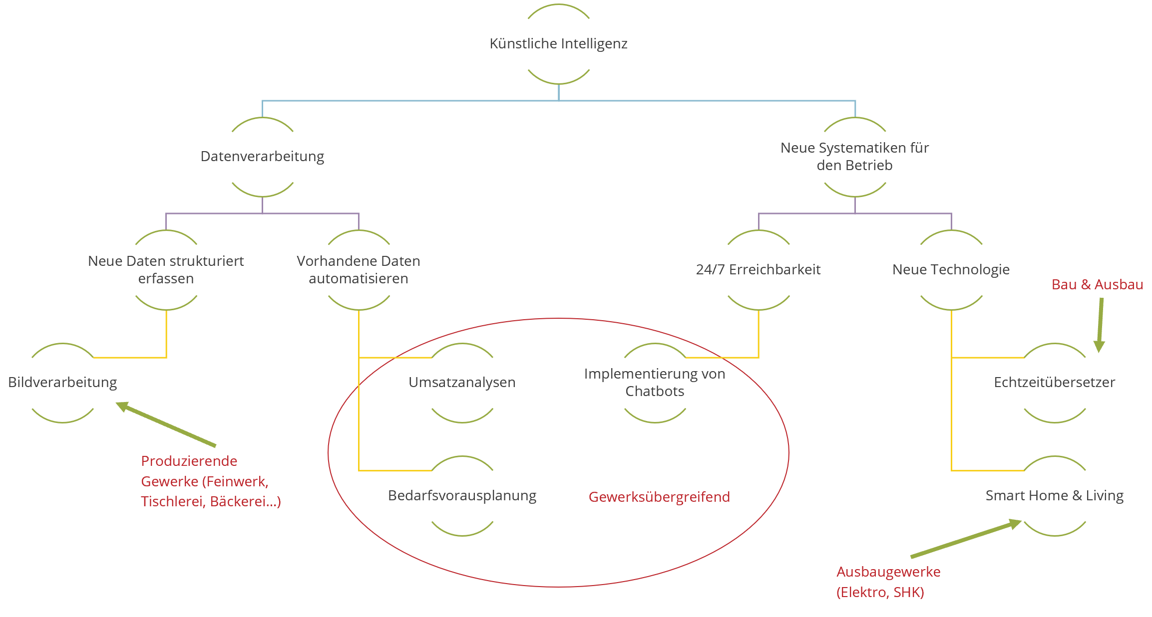 Das nachfolgende Bild zeigt hierbei einige Bereiche auf, in denen KI im Handwerk sinnvoll eingesetzt werden kann – und bei denen schon heute Lösungen existieren!