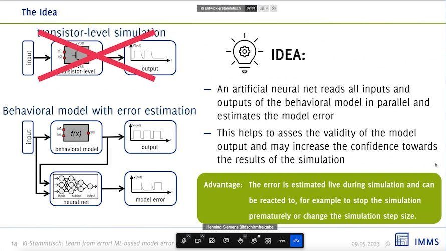 In der Online-Veranstaltung gab Henning Siemen vom IMMS Institut für Mikroelektronik- und Mechatronik-Systeme gemeinnützige GmbH den 9 Teilnehmenden einen Einblick in Einsatzmöglichkeiten von Machine-Learning-Verfahren beim Entwurf von integrierten Schaltungen. Er ging dabei auf die Entwurfsverifikation von integrierten Schaltungen ein, welche viele, u.U. sehr rechenaufwändige Simulationen des Entwurfs benötigt.