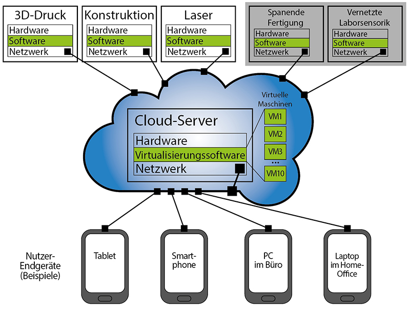 Ein ortsunabhängiger Zugriff auf verteilte Produktionstechnik wie zum Beispiel 3D-Drucker, Laseranwendungen oder Simulationslösungen bietet kleinen und mittleren Unternehmen verschiedene Vorteile.