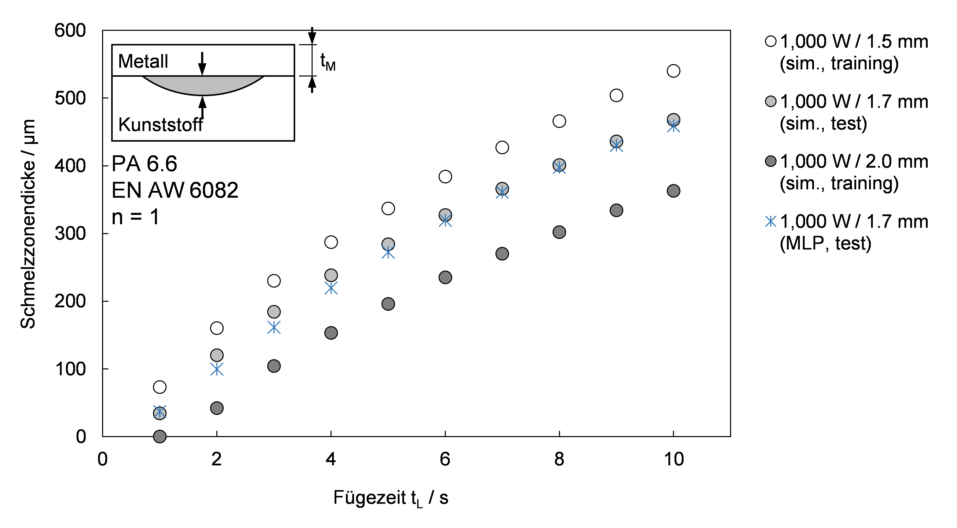 Die Fähigkeit des verwendeten Netzes vorhandene Zusammenhänge in den Eingangsdaten zu erlernen und anschließend auf andere Eingabewerte zu übertragen, die bisher unbekannt waren, ist in der nachfolgenden Grafik visualisiert. In diesem Fall wurden dem Netz zwei Datenreihen (Laserleistung 1000W, Blechstärke Metall 1,5mm und 2,0mm) zur Verfügung gestellt. Nachdem das Netz die in den Eingangsdaten zugrundeliegenden Zusammenhänge erlernt hat, kann es eine Aussage zur Schmelzzonendicke für bisher ungesehene Daten der Reihe „Laserleistung 1000W, Blechstärke 1,7mm“ berechnen, die mit sehr geringen Abweichungen zur tatsächlichen Wertausprägung ausfallen. Das besondere: die gelernten Zusammenhänge lassen sich auch auf Eingangsgrößen, die so nicht in den gegebenen Trainingsdaten vorhanden waren, übertragen.