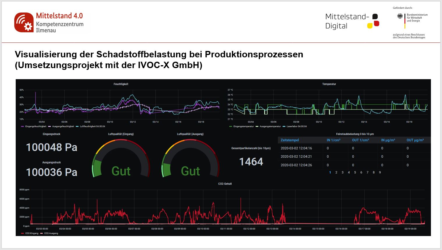 Anschließend zeigten unsere Modellfabriken Prozessdaten und 3D-Druck verschiedene Beispiele zur grafischen Darstellung von Maschinen- und Prozessdaten mit Grafana, ebenfalls eine Open-Source-Anwendung, die sich für den Einsatz in kleinen und mittleren Unternehmen eignet. Die Dashboards können individuell, zugeschnitten auf die Anforderungen der Visualisierung angepasst werden. Constance Möhwald stellte die Raumklima-Überwachung der Jenaer Modellfabrik vor, ein Demonstrator der gemeinsam mit der Modellfabrik Migration aufgebaut wurde, sowie ein Umsetzungsprojekt mit der IVOC-X GmbH, bei dem Grafana genutzt wird, um Schadstoffbelastungen in Produktionsumgebungen vor und nach dem Einsatz von Abluftreinigungsanlagen zu visualisieren. Heinz-Wolfgang Lahmann erläuterte den Einsatz von Grafana bei der Digitalen Zustandsüberwachung von Kühlschmierstoffen in Bearbeitungszentren, ein Demonstrator, der in Modellfabrik Prozessdaten in Schmalkalden besichtigt werden kann.