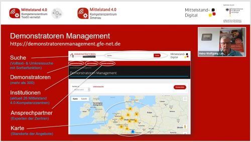 Zum Abschluss gab Heinz-Wolfgang Lahmann den sechs Teilnehmenden noch eine kurze Einführung in das Demonstratorenmanagement von Mittelstand-Digital, in dem Unternehmen nach weiteren Beispielen zur Erfassung und Verarbeitung von Prozessdaten suchen können.