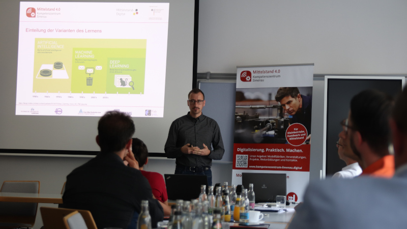 Marcus Glaser, Mitarbeiter der Modellfabrik Vernetzung, brachte den Teilnehmern das Thema Künstliche Intelligenz näher. Praxisbeispiele aus Ilmenau gaben einen Einblick in den Stand der Technik bevor Herr Glaser auf die weiteren Potenziale und Möglichkeiten des Einsatzes von KI einging.