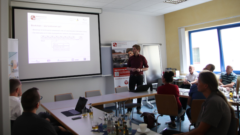 Mathias Eiber, Mitarbeiter der Modellfabrik Vernetzung, erklärte dem Publikum die Funktion der Blockchain und verdeutlichte anhand von Anwendungsmöglichkeiten im Unternehmen deren Potenzial im Einsatz für den Mittelstand.