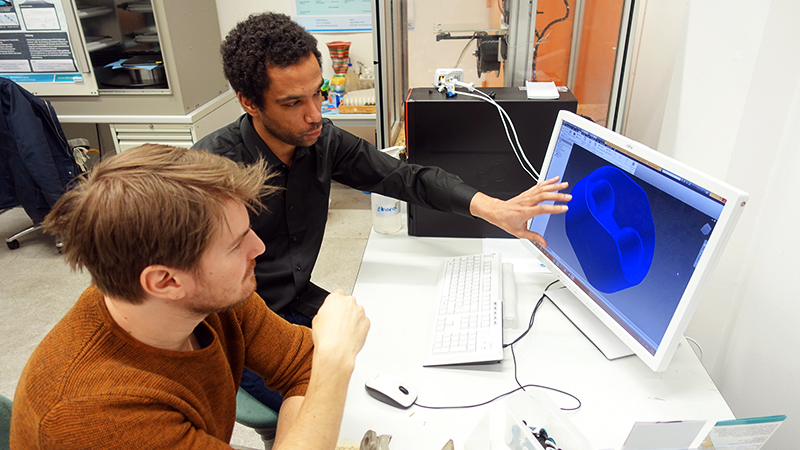 Zunächst wurden alle Anforderungen an das zu entwickelnde Behältersystem aufgenommen und mit den Anwendungsbereichen, Vor- und Nachteilen unterschiedlicher Materialien und Verfahren abgeglichen. Die Konstruktion musste für den 3D-Druck unter Berücksichtigung verfahrensspezifischer Besonderheiten angepasst werden. Schließlich wurde ein Musterdruck mit dem Stereolithographie-Verfahren angefertigt. Dazu verwendete man ein transparentes Material: ein großer Vorteil für die Experimente. So konnte der Mischprozess beider Flüssigkeiten der Desinfektionslösung gut beobachtet werden. Nach der Bewertung der Testergebnisse wurden weitere Anpassungen der Konstruktions- und 3D-Modelldaten, unterstützt durch Patrick Ongom-Along von der Modellfabrik 3D-Druck, vorgenommen. „Diese fachliche Begleitung hat uns sehr geholfen“, sagt Robert Hellmundt rückblickend. Mit Hilfe des 3D-Drucks können wir unsere Ideen schnell und kostengünstig in Prototypen verwandeln und in Zukunft wissen wir, worauf es bei der Konstruktion und Aufbereitung der 3D-Druck-Daten ankommt.“