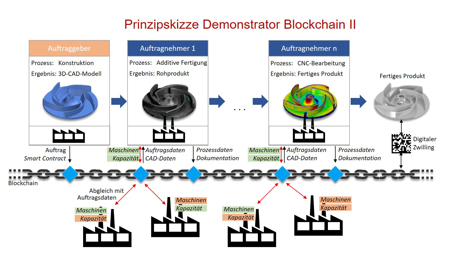 Der Blockchain I-Demonstrator wurde umfangreich erweitert, um eine Auftragsvergabe und -steuerung in einem kooperativen Wertschöpfungsnetzwerk abzubilden. Maschinen werden in der Blockchain als Digitale Zwillinge abgebildet. Sensorik und Schnittstellen ermöglichen den Datenaustausch zwischen den Digitalen Zwillingen und ihren physischen Gegenstücken.