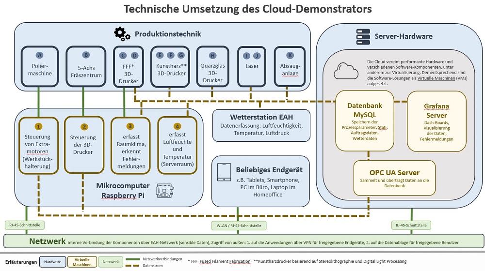 Das Kernstück der Cloud bildet ein Hardware-Server mit hoher Prozessorleistung, Speicherkapazität und einer äußerst leistungsfähigen Grafikkarte. Die auf dem Hardware Server installierte kommerzielle Virtualisierungssoftware bildet die Ressourcen ab und stellt sie dem Netzwerk als virtuelle Maschinen zur Verfügung. Drei dieser virtuellen Maschinen sind ein OPC-UA-Server zum Sammeln und Übertragen der Daten, ein MySQL-Server als Datenspeicher und ein Grafana-Server zur Visualisierung von Daten und Fehlermeldungen. Zur Maschinensteuerung, Raumklimaerfassung oder zum Erkennen und Melden von Maschinenfehlern werden mehrere Raspberry Pi – Mikrocomputer eingesetzt.