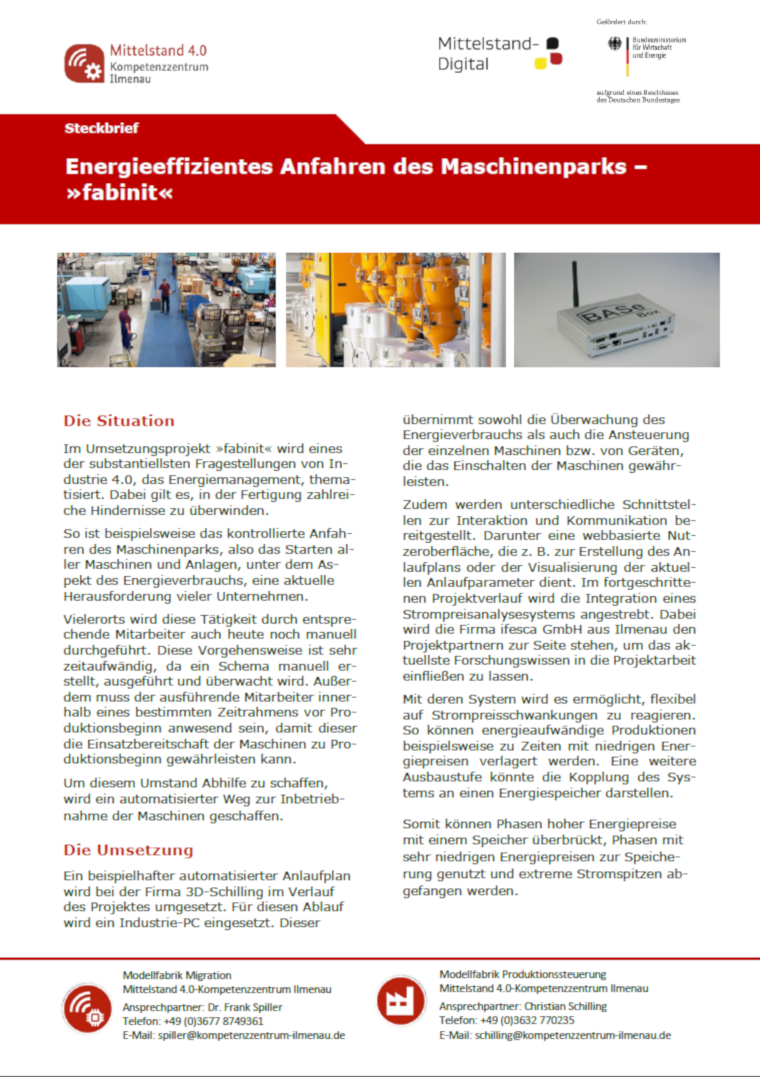Ein beispielhafter automatisierter Anlaufplan wird bei der Firma 3D-Schilling im Verlauf des Projektes umgesetzt. Für diesen Ablauf wird ein Industrie-PC eingesetzt. Dieser übernimmt sowohl die Überwachung des Energieverbrauchs als auch die Ansteuerung der einzelnen Maschinen bzw. von Geräten, die das Einschalten der Maschinen gewährleisten. Zudem werden unterschiedliche Schnittstellen zur Interaktion und Kommunikation bereitgestellt. Darunter eine webbasierte Nutzeroberfläche, die z. B. zur Erstellung des Anlaufplans oder der Visualisierung der aktuellen Anlaufparameter dient. Im fortgeschrittenen Projektverlauf wird die Integration eines Strompreisanalysesystems angestrebt. Dabei wird die Firma ifesca GmbH aus Ilmenau den Projektpartnern zur Seite stehen, um das aktuellste Forschungswissen in die Projektarbeit einfließen zu lassen.