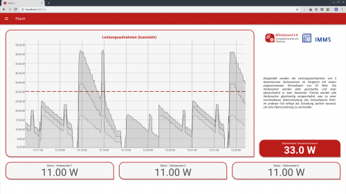 Die gezeigte Lösung ist die Vorstufe für ein Demonstrationsprojekt der Modellfabrik Migration, welches einen optimierten Produktionsanlauf nach Sonn- und Feiertagen ermöglichen soll. Ziel ist das priorisierte, fertigungsplangesteuerte Hochfahren von z.B. Spritzgussmaschinen und weiteren Nebenaggregaten. Das Monitoring des Energieverbrauchs beim Erwärmen der Maschinen und das gezielte Steuern des Vorgangs im gesamten Maschinenpark ermöglicht das Einhalten vertraglich mit dem Energieversorger vereinbarter Lastgrenzen, deren Überschreitung mit hohen Kosten verbunden sein kann. Gleichzeitig wird es möglich, dass z.B. der Werkleiter den Gesamtprozess auf einem mobilen Endgerät beobachten kann bzw. durch dieses bei auftretenden Problemen gewarnt wird.