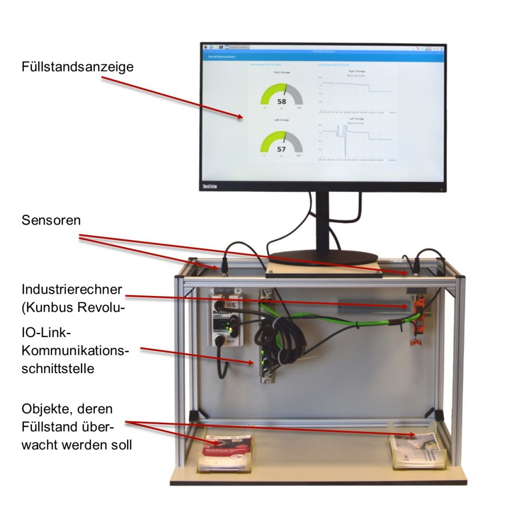 Die Erfassung des Füllstandes erfolgt über Ultraschallsensoren, welche über eine Abstandsmessung die jeweilige Höhe des aufgestapelten Materials ermitteln. Die Sensoren sind per IO-Link digital mit einer Empfangseinheit (IO-Link-Master) verbunden. Mit IO-Link kommt ein flexibles und standardisiertes Kommunikationssystem zum Einsatz, welches u.a. eine einfache Kalibrierung und Parametrisierung der Sensoren ermöglicht. Der IO-Link-Master lässt sich einfach in bestehende IT-Netzwerke einbinden, so dass die Sensordaten durch Steuerungen und PCs empfangen werden können. Im hier gezeigten Beispiel werden die Sensordaten direkt durch einen industriegeeigneten kostengünstigen Mini-PC empfangen, welcher die Sensordaten speichert, visualisiert und auswertet. Bei Bedarf können z.B. beim Unterschreiten zuvor festgelegter Füllhöhen lokale Alarmierungen generiert oder Emails an beliebige Empfänger verschickt werden.