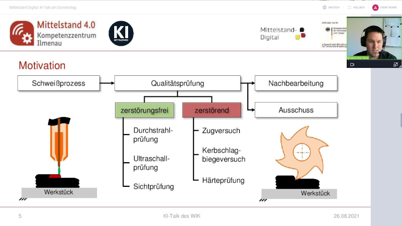 Das erklärte Maximilian Rohe vom Mittelstand 4.0-Kompetenzzentrum Ilmenau diese Woche den 19 Teilnehmern im KI-Talk von Mittelstand-Digital anhand eines Lichtbogenschweißprozesses. Beim Schweißen kann das Auftreten von Poren, z.B. durch ungenügende Schutzgaszufuhr oder Verunreinigungen die entstehende Schweißnaht unzureichend machen. Schweißer hören dies bereits beim Vorgang und können gegensteuern.