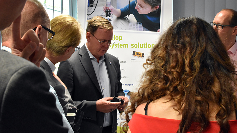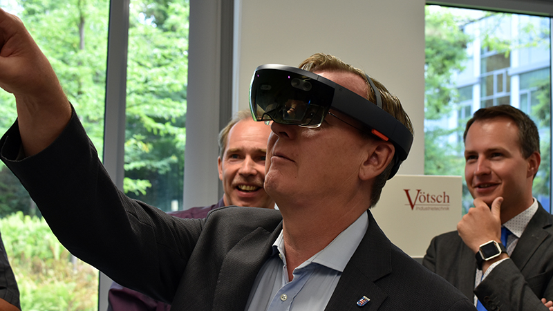 Eine weitere Perspektive, die das Kompetenzzentrum für Akteure des Thüringer Mittelstands aufzeigt, begutachtete Ramelow durch eine Datenbrille. Sie ist Teil einer Augmented-Reality-Lösung, welche ihre Umgebung erfasst, bewertet und diese um Daten erweitert, die dem Nutzer umgebungsabhängig angezeigt werden. „Damit bekommen Unternehmen auch eine gute Sicht auf einen Teil der Arbeitswelt 4.0,“ so Ramelow weiter. „Wenn Fachkräfte in der Produktion mit Hilfe virtueller Objekte sehen können, wo und was genau in einer Anlage geschieht, kann das ihre Arbeit wesentlich erleichtern.“