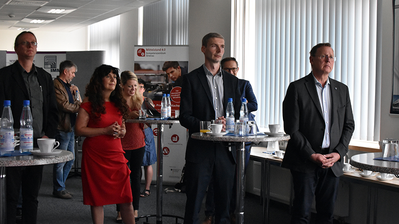 Ramelow wurden verschiedene Demonstratoren in der Modellfabrik „Migration“ am IMMS präsentiert. Mit ihnen wird greifbar, wie sich Prozesse in bestehenden Maschinenparks kosteneffizient durch nachrüstbare vernetzte Sensoren und Cloud-Lösungen optimieren lassen und damit für die steigende Nachfrage an kundenspezifischen Produkten und Dienstleistungen fit gemacht werden können. „Digitalisierung ist hier nicht nur ein Hebel für effizientere Abläufe, die man mit einer Vernetzung von Daten erreichen kann,“ so Ramelow. „Man muss auch aus einer anderen Perspektive auf Vernetzung schauen: Gerade für die Thüringer Wirtschaft mit vorrangig kleinen und mittlere Unternehmen bietet die Digitalisierung die Chance, ihre Kräfte noch mehr als bisher in Wertschöpfungsnetzwerken zu bündeln, um im internationalen Wettbewerb zu bestehen. Die Arbeit des Kompetenzzentrums ist dafür genau richtig angesiedelt.“