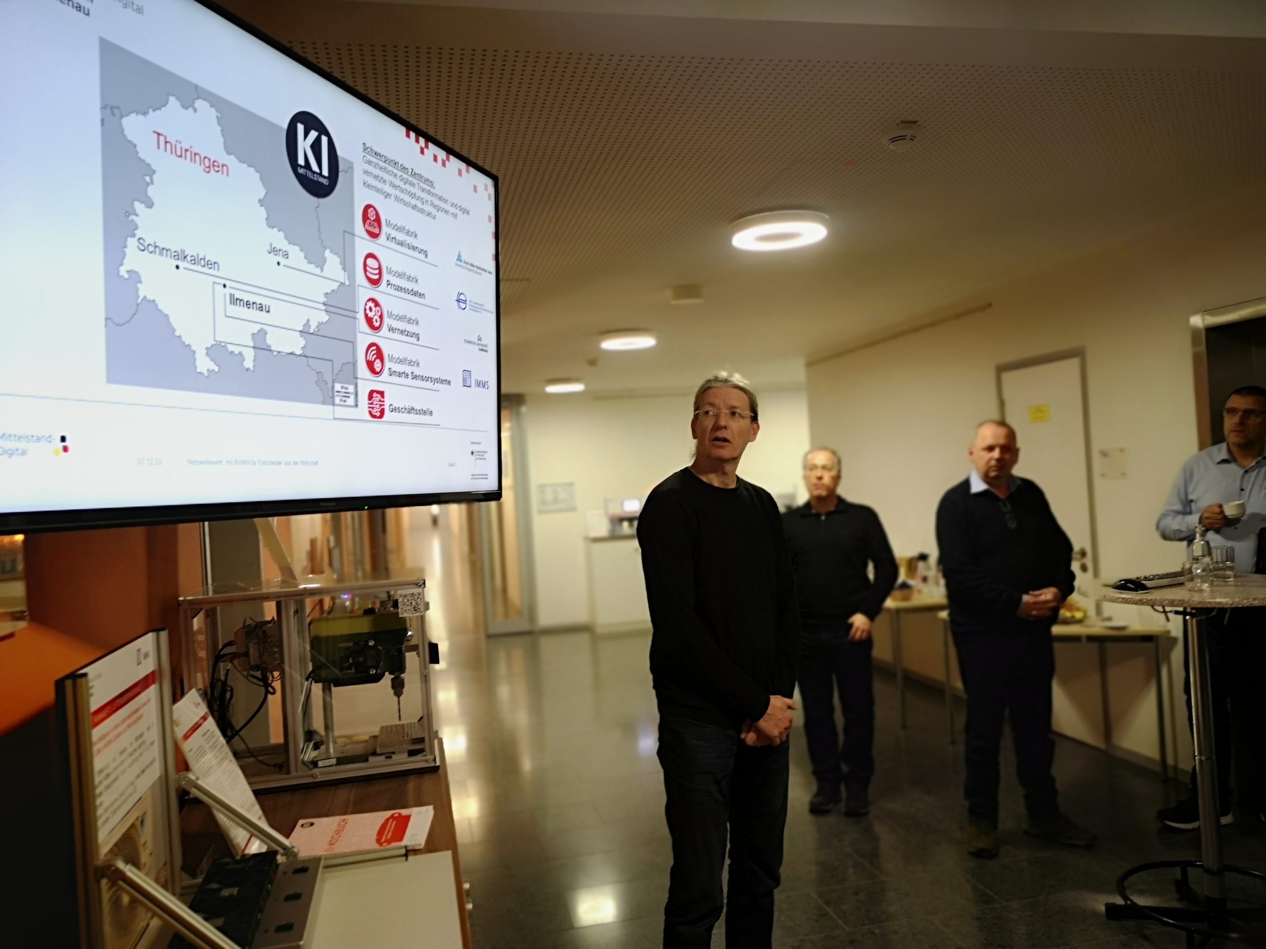 Wolfram Kattanek von der Modellfabrik „Smarte Sensorsysteme“ stellte dafür umfangreich die Unterstützungsangebote des Zentrums vor und berichtete von zahlreichen Best-Practice-Beispielen, um so den Anwesenden einen Einblick in die Möglichkeiten der digitalen Transformation zu geben. Eine Vielzahl von Demonstrationslösungen standen in der Modellfabrik als Diskussionsgrundlage bereit.