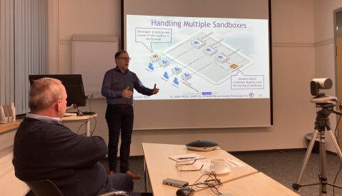 In einem Impulsvortrag präsentierte Dr. Jürgen Nützel von der 4FriendsOnly.com Internet Technologies AG aus Ilmenau verschiedene Möglichkeiten der Entwicklung von Software in der Cloud. Dabei kommen z.B. Sandboxen als Entwicklungsumgebung, die bei verschiedensten Cloud-Anbietern oder in eigenen Cloud-Lösungen gehostet werden können, zum Einsatz. Im Vortrag wurden Vor- und Nachteile der unterschiedlichen Lösungen und der Cloud-Anbieter diskutiert. Am Ende des Vortrags wurde den Teilnehmern life gezeigt, wie einfach das Einrichten eine Sandboxlösung durch den Administrator ist, wie der Entwickler A mit der Sandbox arbeitet, der Admin die Sandbox von Entwickler A für Entwickler B klont und wie dann der Entwickler B mit der geklonten Sandbox weiterarbeiten kann.