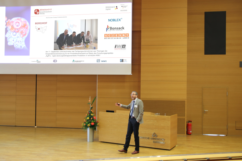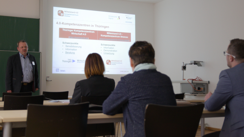 Im Anschluss an die Impulsvorträge, bei denen Koordinator Prof. Dr. Jean Pierre Bergmann vom Fachgebiet Fertigungstechnik das Mittelstand 4.0-Kompetenzzentrum Ilmenau vorstellte, führten Dr. Frank Spiller von der Modellfabrik Migration und Ninette Pett von der Modellfabrik Vernetzung mit interessierten Gästen einen Workshop zum Thema „Strategische Planung in KMU“ durch.