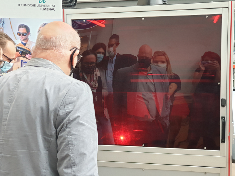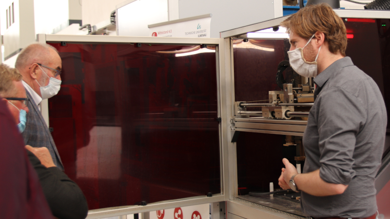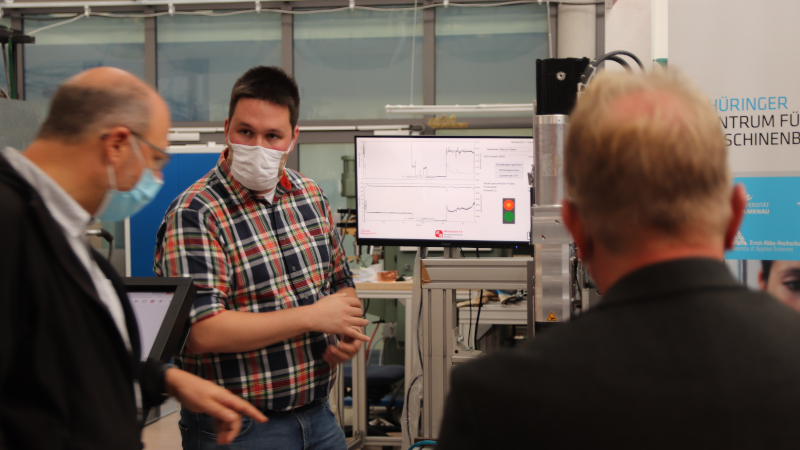An der an der TU Ilmenau ansässigen Modellfabrik Vernetzung wurden Anwendungen für KMU im Bereich KI und Blockchain präsentiert. So kann durch den Einsatz Künstlicher Intelligenz das Verfahren des Rührreibschweißens nachhaltiger gestaltet werden und durch Vertragsabschlüsse in einer Blockchain sichere kooperative Wertschöfpungsnetzwerke gegründet werden. In den anschließenden Diskussionen zeigten sich die Teilnehmer besonders an den zugrundeliegenden technischen Verfahren interessiert.