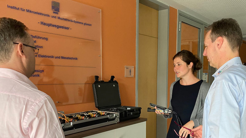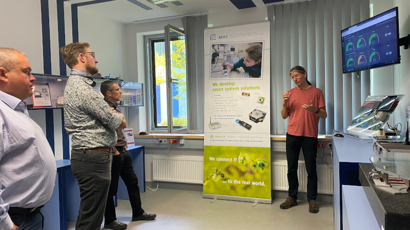 In der Modellfabrik Migration am Institut für Mikroelektronik – und Mechatronik-Systeme (IMMS) erhielten die Teilnehmer einen Überblick über die Themen der nachrüstbaren Sensorik und Künstlichen Intelligenz und deren unterschiedliche Einsatzmöglichkeiten im industriellen Kontext. Diverse Demonstrator-Aufbauten, wie die nachrüstbare Lagerbestandsüberwachung, die Druckluftüberwachung oder auch das Energiemanagement von Maschinen und Anlagen konnten das Interesse der Teilnehmer wecken und ihnen Möglichkeiten aufzeigen, Prozesse zu optimieren.