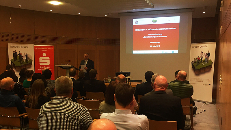 Herr Roland Friedrich, Vorsitzender des Vorstandes der Sparkasse Bad Kissingen, betonte in seinem Vortrag, dass Deutschland schon immer ein Innovationsland war. Dies ist auch so geblieben, aber nur auf dem Gebiet Hardwareentwicklung, sodass Nachholbedarf in der Software-Branche besteht. Nach dem Vortrag der Sparkasse, die seit mehr als 183 Jahren ein Partner für Förderprojekte für Mittelstand ist, stellte sich das Mittelstand 4.0-Kompetenzzentrum Ilmenau vor. Heinz-Wolfgang Lahmann, der in der Modellfabrik Prozessdaten tätig ist, schilderte die Kooperationsmöglichkeiten zwischen dem Mittelstand 4.0-Kompetenzzentrum und KMU. Benjamin Hofmann, ebenfalls Mitarbeiter der Schmalkaldener Modellfabrik, zeigte verschiedene Praxisbeispiele und Projekte zur Digitalisierung von Produktions- und Unternehmensprozessen auf. Außerdem präsentierte er die Projekte zur Kühlschmierstoffüberwachung, Schleifscheibenvermessung und Prozessdatenerfassung. Dr. Svitlana Dontsova gab Einblicke in die Modellfabrik Migration. Das Projekt „Vom Schwimmbecken in die Cloud: eine Erfolgsgeschichte 4.0“ beschreibt ein erfolgreiches Umsetzungsprojekt mit der Schwimmhalle in Ilmenau, außerdem berichtete sie von Kommunikationsplattformen für KMU und dem mobilen Sensorkoffer.