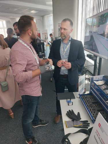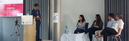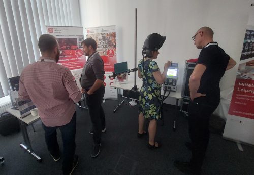Das Programm mit verschiedenen Vorträgen, Diskussionsrunden, Live-Demonstrationen und Vernetzungsmöglichkeiten bot vielfältige Gelegenheiten, mit Expertinnen und Experten aus den Mittelstand-Digital Zentren und untereinander ins Gespräch zu kommen. Am Stand unserer Modellfabrik Virtualisierung konnten die Teilnehmenden virtuell schweißen und Finger-Exoskelette ausprobieren, bei deren individueller Auswahl eine App unterstützt. Für uns besonders interessant war der Praxistalk mit Sarah Wiederhold (Personalreferentin der JAT – Jenaer Antriebstechnik GmbH), Nga Le (Geschäftsführerin der EDUBAO GmbH), Sabine Ayeni (Mitgründerin der Agentur grün gelb türkis GbR) und Sven Finster (BBG Bischofsheimer Baubetrieb GmbH & Co. KG), die aus unterschiedlichen Perspektiven von ihren Erfahrungen zur Fachkräftegewinnung und -sicherung berichteten.