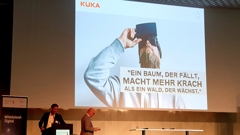 Inspirierende Vorträge zeigten, wie sich Berufsfelder in den nächsten Jahren verändern werden. Neugier zur Problemlösung und Vertrauen in die Kraft der schöpferischen Intelligenz, dass stets neue Wege entstehen – diese Komponenten sollten im Entwicklungsprozess an erster Stelle stehen“, ermutigte Prof. Thomas Thiessen, Leiter des Mittelstand 4.0-Kompetenzzentrums Kommunikation. Es ginge nicht darum, das eigene Unternehmen innerhalb kürzester Zeit komplett zu digitalisieren, sondern vielmehr um eine Entwicklung in kleinen Schritten. Wichtig sei dabei, keine Insellösungen zu schaffen, sondern von vornherein die Vernetzung zwischen Menschen und Maschinen, ja sogar ganzen Betrieben, mitzudenken.